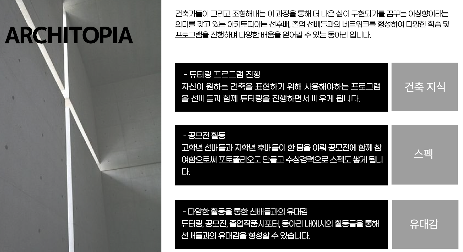 건축학전공 4개의 학술 동아리 중 아키토피아는 선후배, 졸업한 선배들과 네트워크를 형성하여 다양한 학습, 프로그램 등을 진행하는 동아리. - 동아리 활동 내역