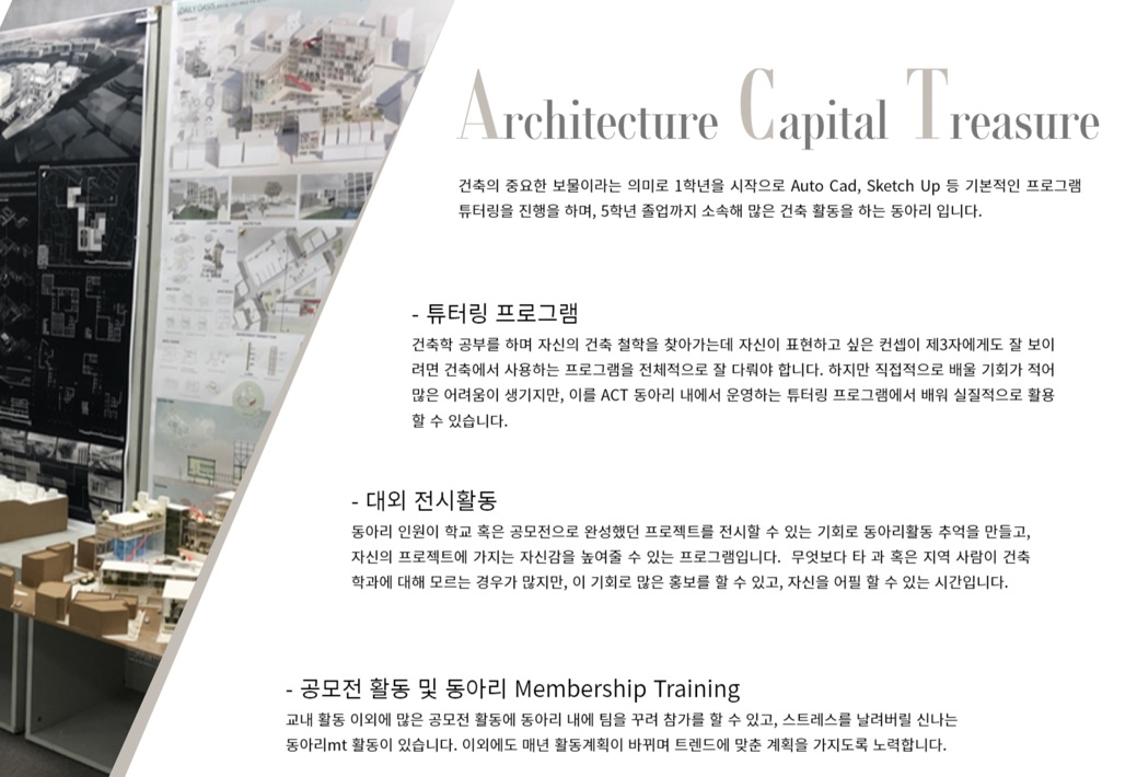 ‘Architecture Capital Treasure’ 건축의 중요한 보물이라는 의미로 1학년들은 Auto Cad와 Sketch Up이라는 가장 기본적인 프로그램을 알려주어 2학년이 되어 실질적인 설계를 진행할 때를 대비할 수 있도록 도와준다. 2학년들은 배우고 싶은 프로그램을 조사하여 스케치업/ 레빗/ 라이노/포토샵 등 다양한 프로그램들을 배울 수 있으며 2018년도부터 전시공간을 대여하여 학생들의 기량을 마음껏 뽐낼 수 있는 행사 또한 진행하고 있음. 또한, 분위기도 좋아 동아리원들의 참여율이 항상 90% 이상을 자랑하는 동아리. - 동아리 활동 내역