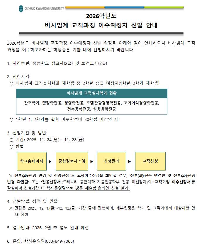 2026학년도 비사범계 교직과정 이수예정자 선발 안내