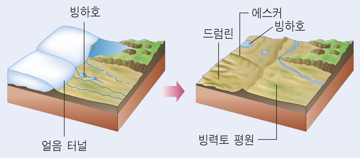 위에 첨부한 사진은 빙하 퇴적 지형에 관한 모식도입니다. 그림에는 나타나있지 않지만 얼음 터널 앞에 모레인(빙퇴석)이 발달하여 빙하의 한계선을 보여준다고 교과서에는 서술이 되어있습니다.