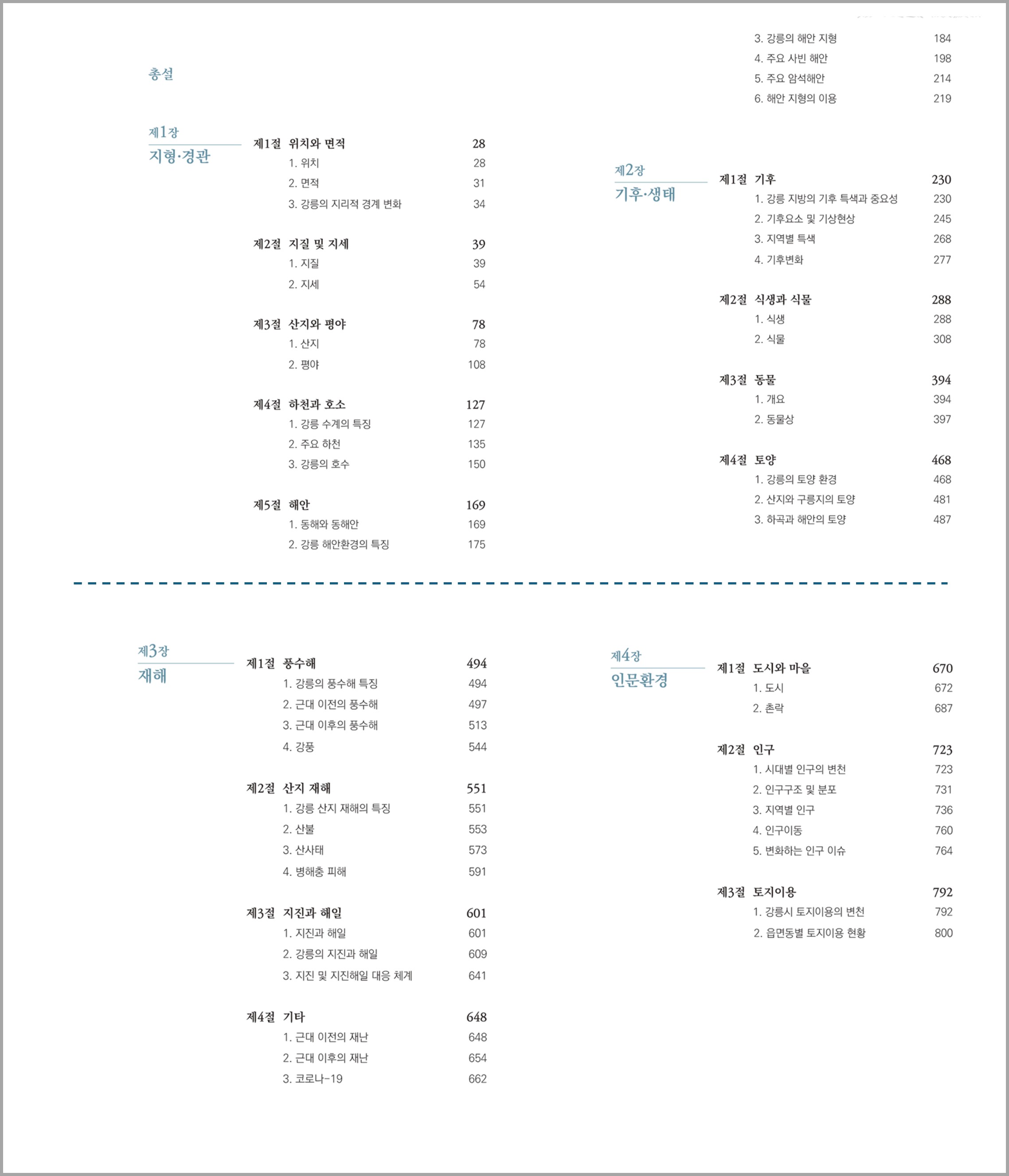 강릉시사 1편은 총 832쪽 분량으로, 제1장 지형·경관, 제2장 기후·생태, 제3장 재해, 제4장 인문환경으로 체계적으로 구성되어 있다. 각 장은 최신 학술 연구 성과와 현장 조사 자료를 바탕으로 집대성되었으며, 강릉의 독특한 지리적 특성 및 환경 조건을 상세히 다룬다. 강릉 지방의 자연 및 인문환경에 대한 방대한 문헌을 체계적으로 정리한 이 종합서는 지역민과 학생은 물론 강릉 지리 연구자들에게 훌륭한 참고 문헌이 될 것이다.