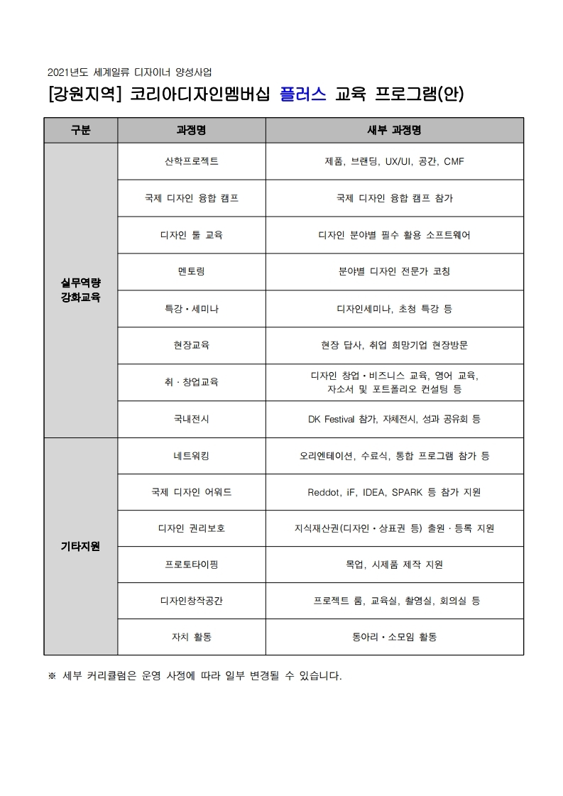 -전국의 잠재력 있는 학생들을 선발하여 다양한 실무형 디자인 교육을 통해 산업현장에 바로 투입 할 수 있는 세계일류 수준의 실무 디자이너로 육성하는 디자인 멤버십 프로그램.