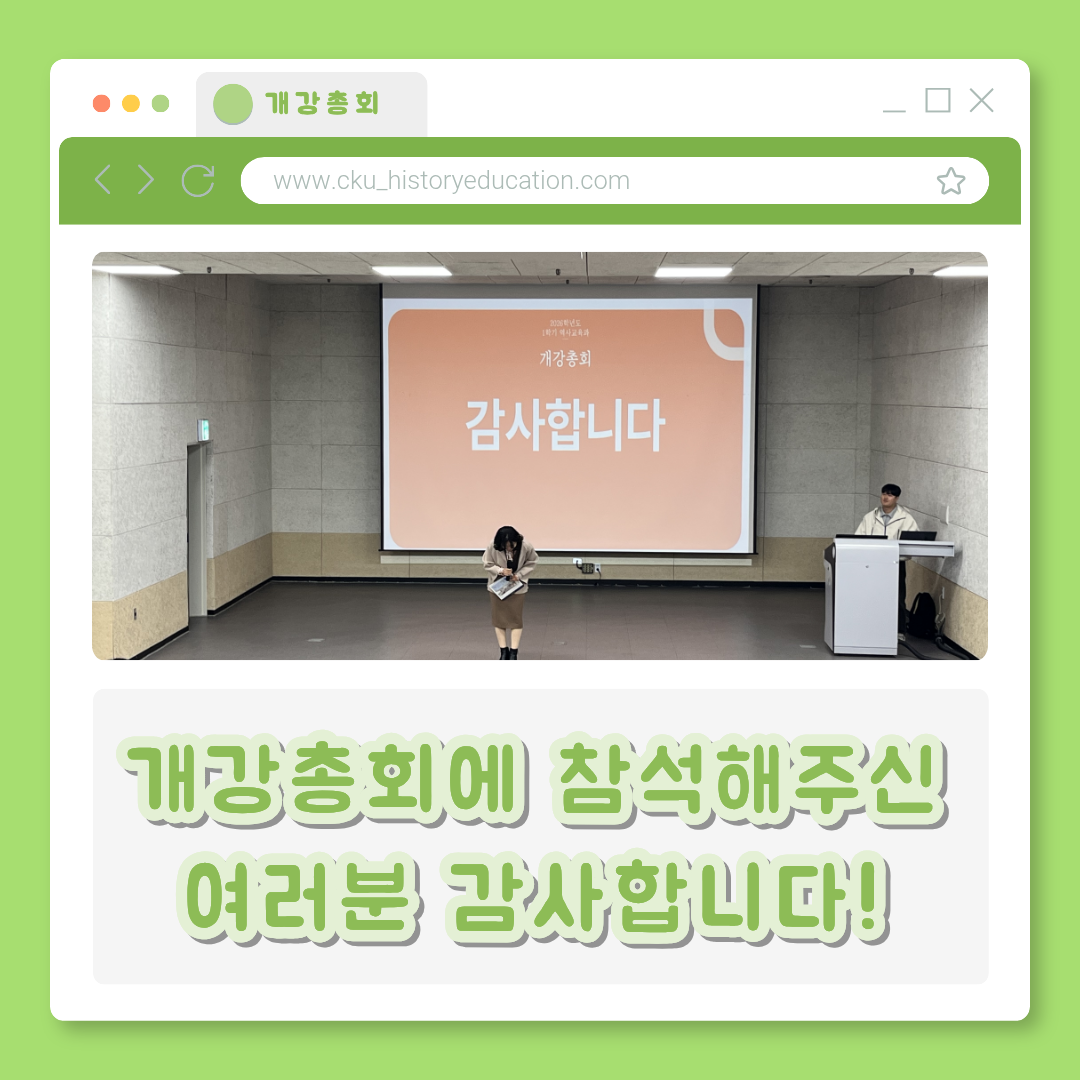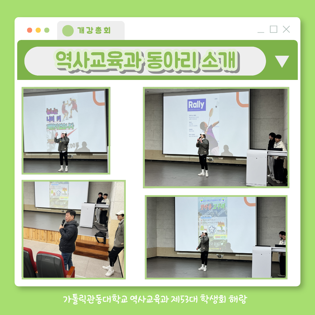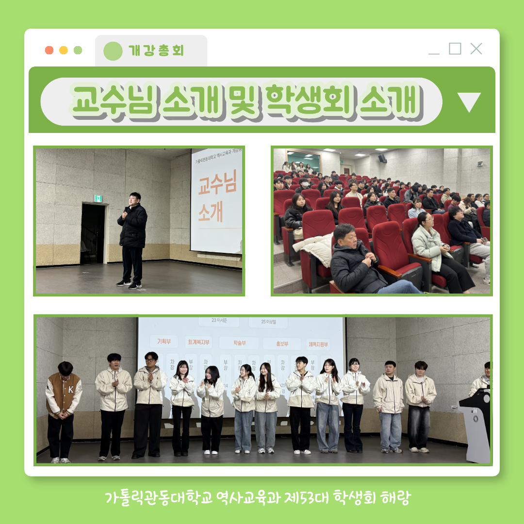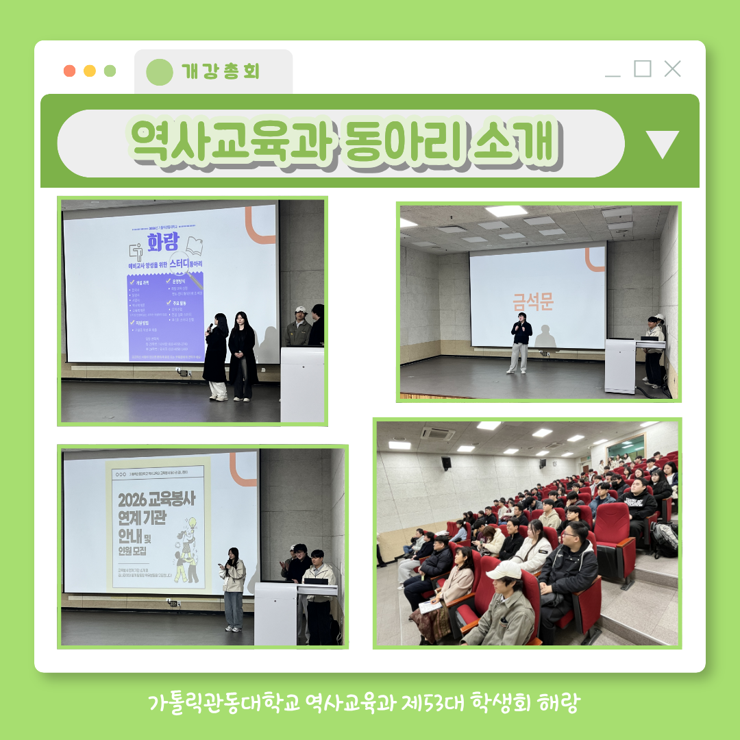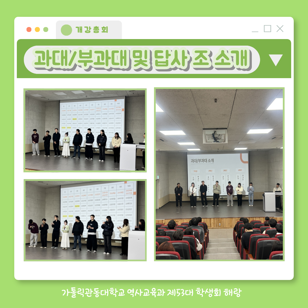 이번 역사교육과는 2026년 3월 9일 월요일 오후 5시 20분 요셉관 B101에서 개강총회를 하는 시간을 가졌습니다.