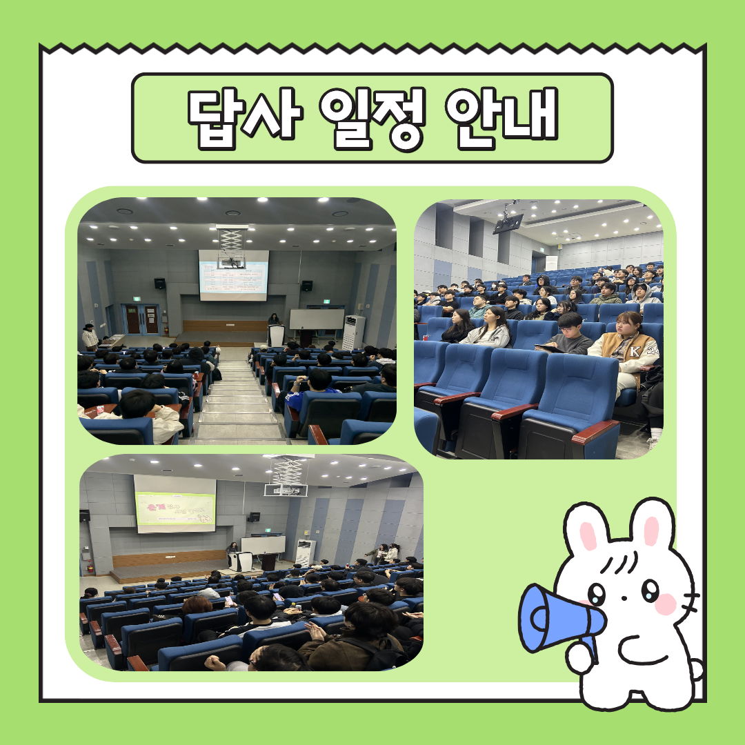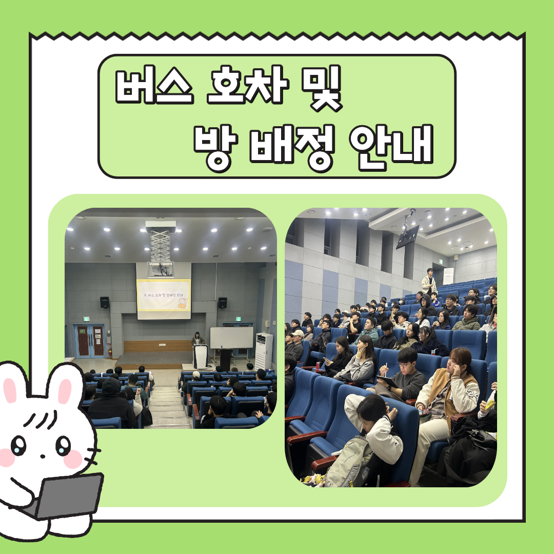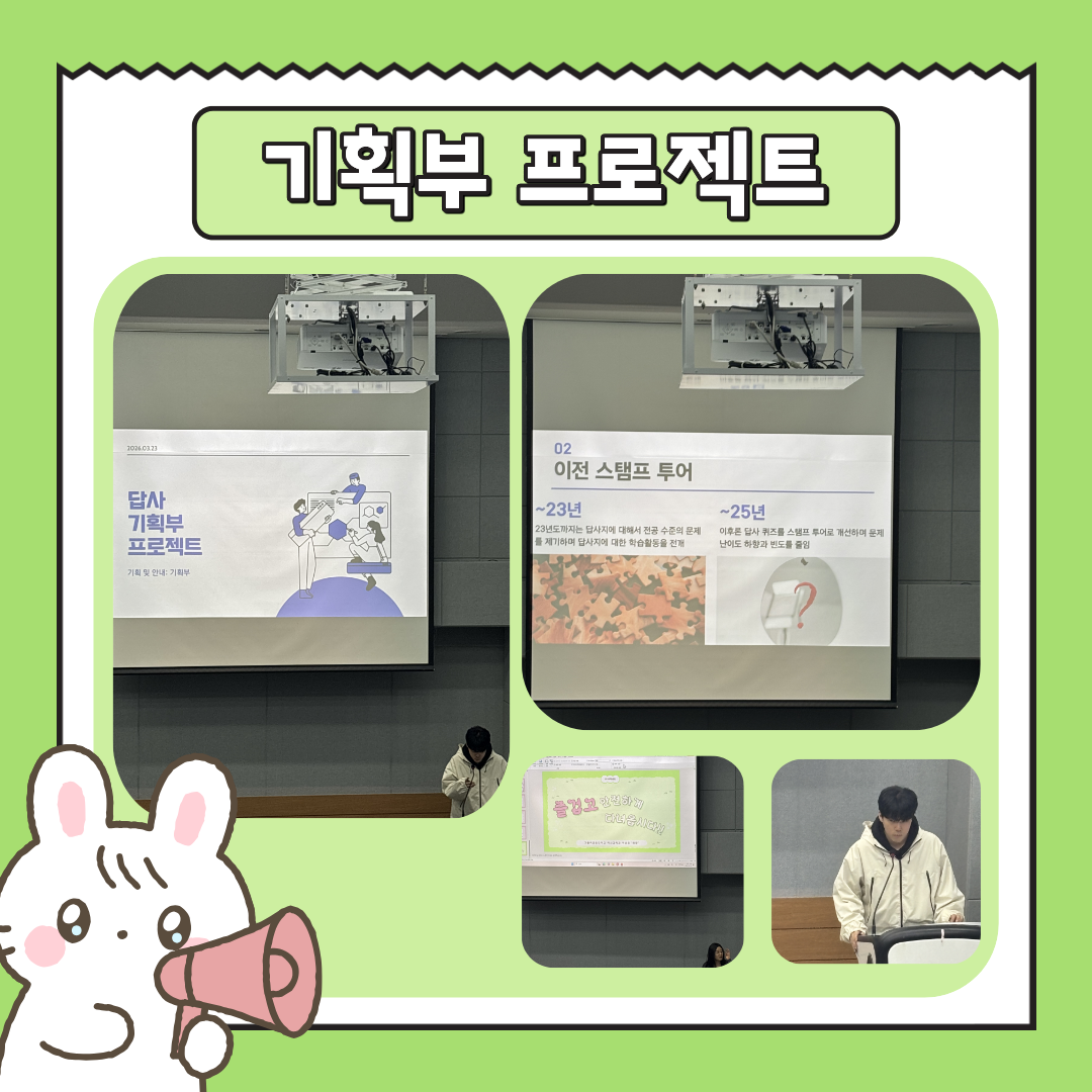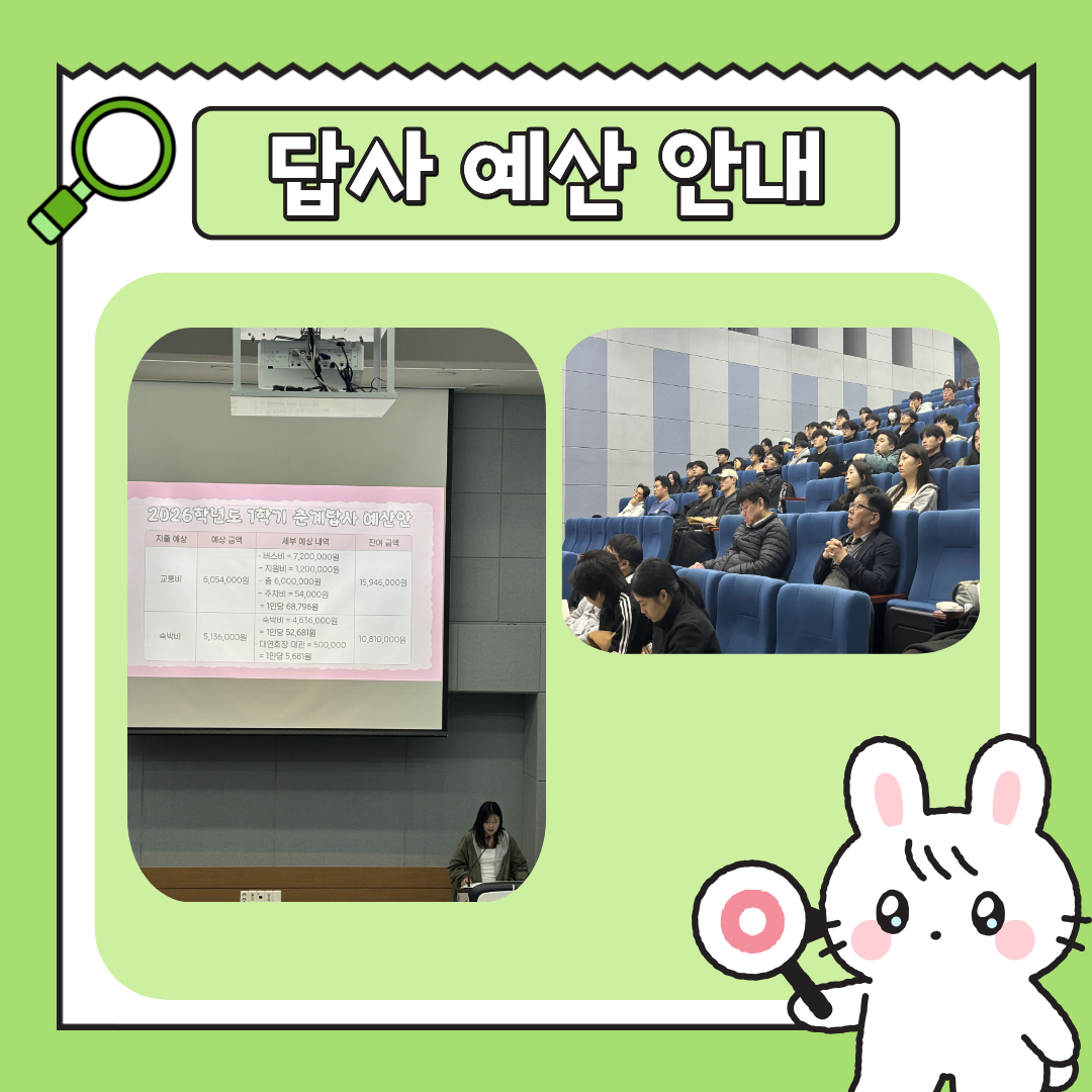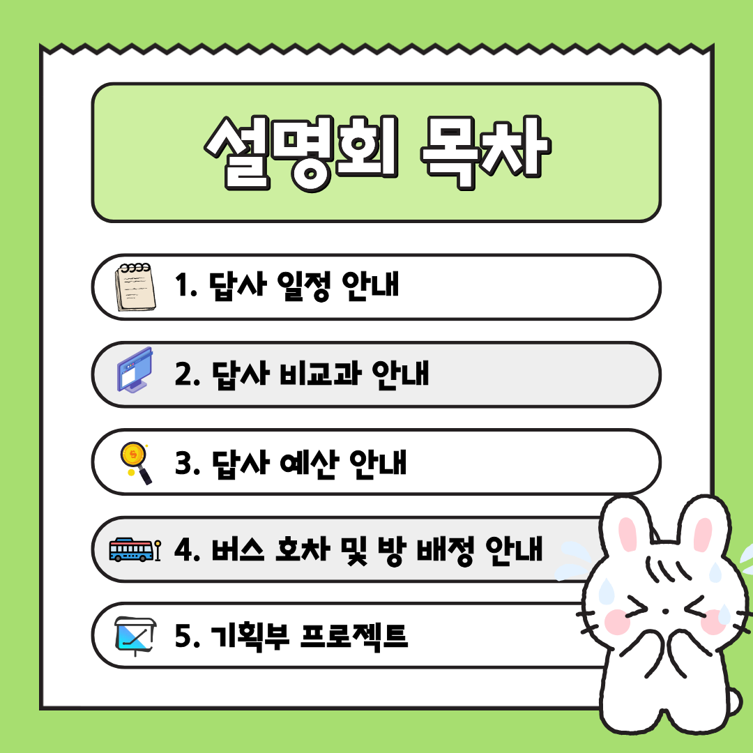 이 날은 답사 일정, 답사 비교과 안내, 답사 예산 안내, 버스 호차 및 방 배정 안내 및 기획부 프로젝트에 대한 설명이 있었습니다.
