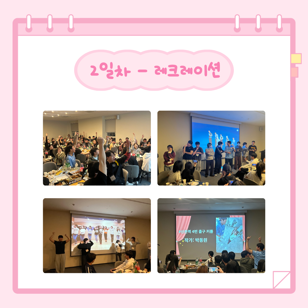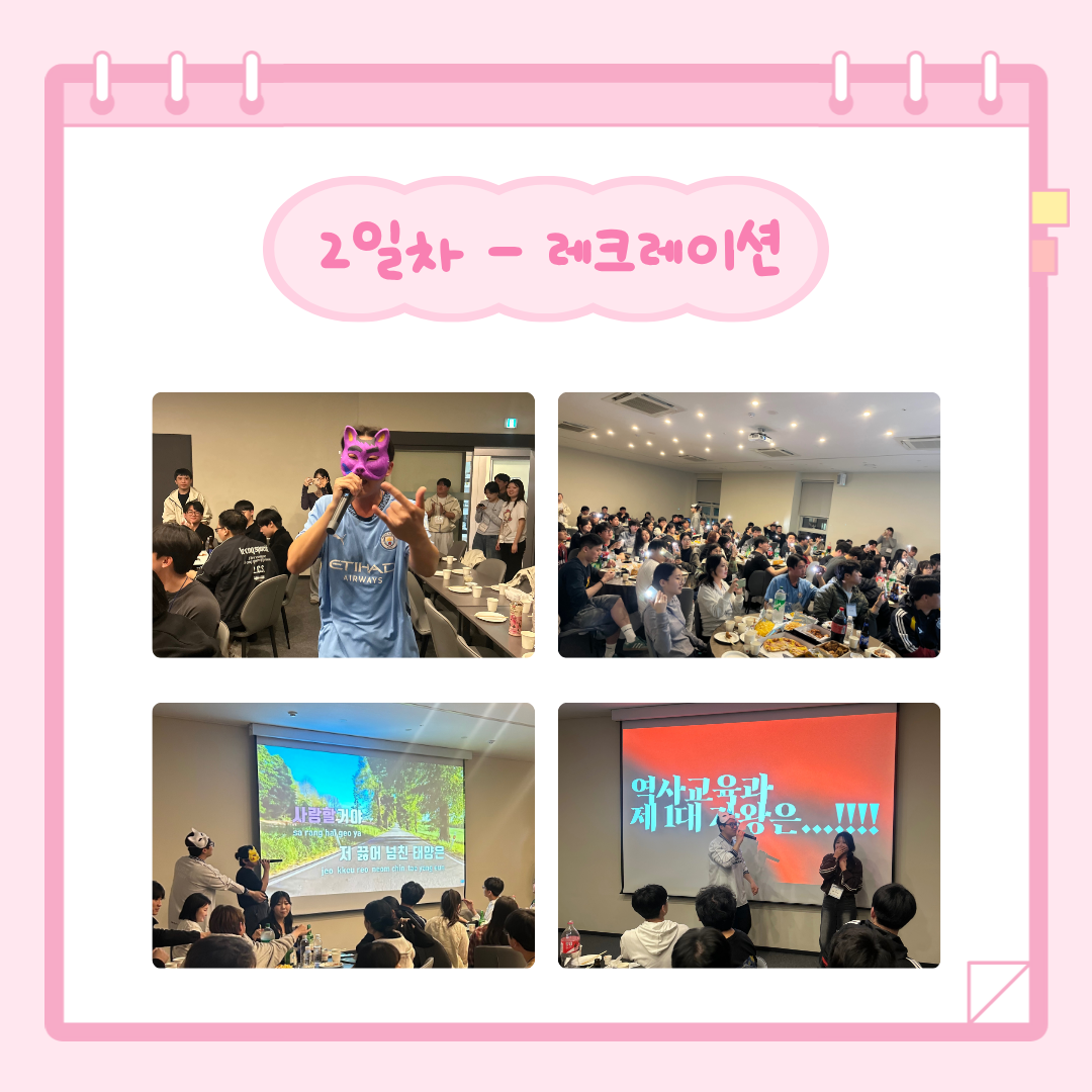 저녁에는 숙소에 모여 복면가왕, 사진전 시상, 퀴즈 맞추기 등 레크레이션을 진행하며 춘계답사를 더욱 즐겁게 즐길 수 있었습니다.