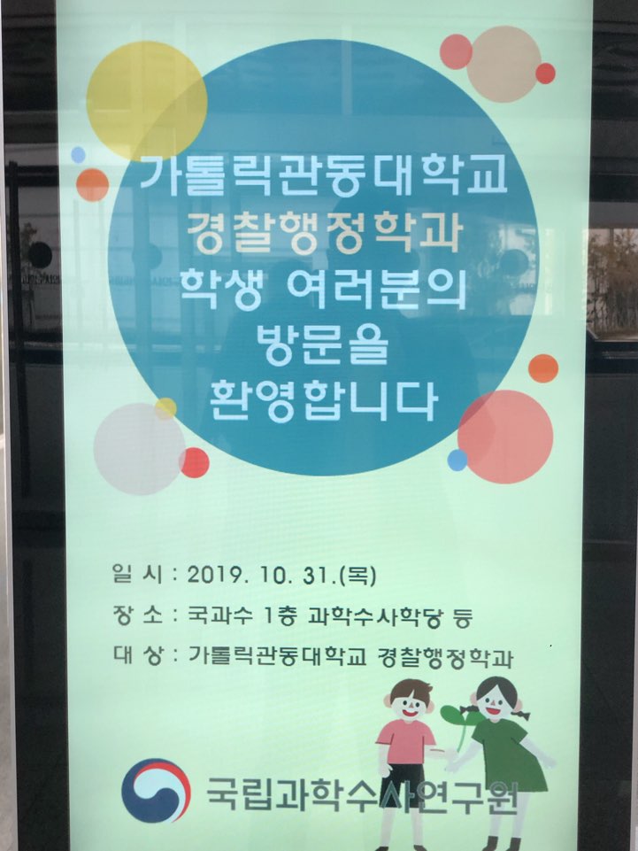 국립과학수사연구원 본관에 들어서니 가톨릭관동대학교 경찰행정학과 학생들의 방문을 환영해주셨습니다.