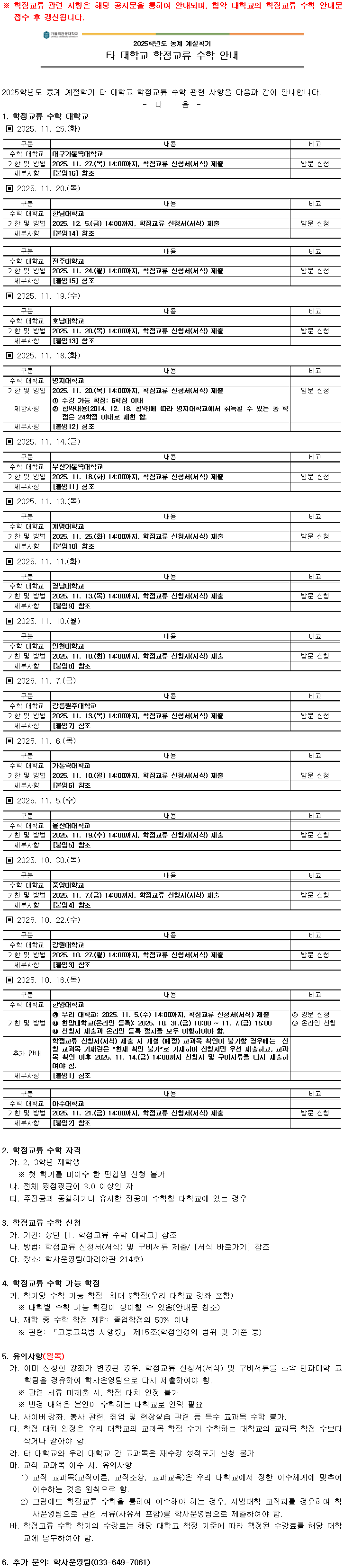 2025학년도 동계 계절학기 타 대학교 학점교류 수학 안내